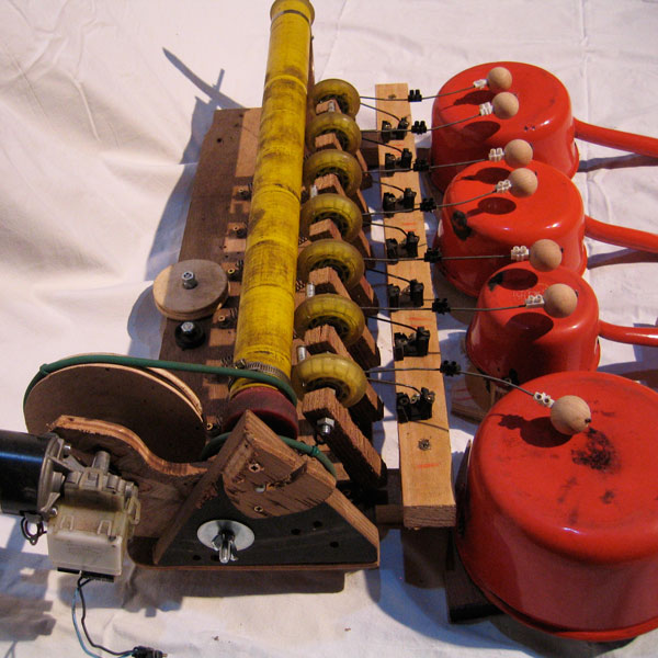 Musician and factotum, Jéranium creates sound machines from recycled materials. Fond of mechanical music, he splits his activities in different musical projects, working with the improvisation group Silent Block. He is the author and capo-orchestra of Léon Napakatbra, street mechanical concert based on fair complex paraphernalia. Meanwhile he organizes interactive exhibitions of sound machines as “Le Son des Choses” and “Les Guitares”.